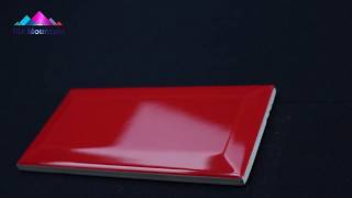 A pillar-box red, bevelled edge ceramic wall tile in a gloss finish.