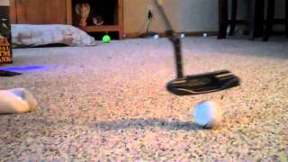 This is a test to see which putter has the earliest roll off the face. This board shows when a ball struck with a putter with a lofted face launches and skips without ...
